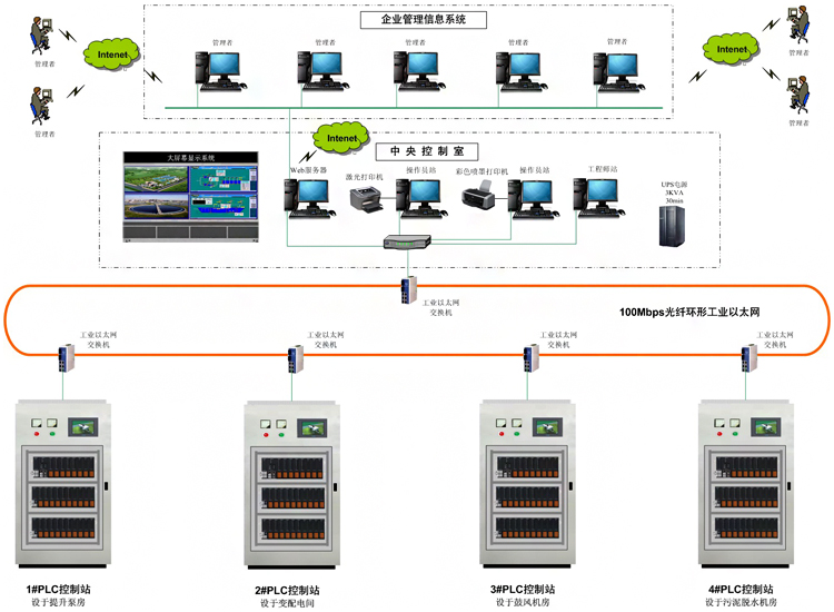 自動化系統(tǒng)有1個中央1個中央控制室、4個現(xiàn)場PLC控制站組成?,F(xiàn)場PLC控制站,由可編程序控制器(PLC)系統(tǒng)及檢測儀表組成,對污水處理廠各工藝過程進行分散控制;再由中央控制室(CCR),對全廠實行集中管理。中央控制室、PLC控制站之間的數(shù)據(jù)通訊采用高速的、實時的工業(yè)以太網(wǎng),網(wǎng)絡(luò)結(jié)構(gòu)為環(huán)形,通訊速率為100Mbps,傳輸介質(zhì)為光纖。中央控制站設(shè)于綜合樓中控室;現(xiàn)場控制站設(shè)4個,分別位于進水泵房(1#PLC控制站)、變配電間(2#PLC控制站)、鼓風(fēng)機房(3#PLC控制站)、污泥濃縮脫水機房(4#PLC控制站)。案例演示